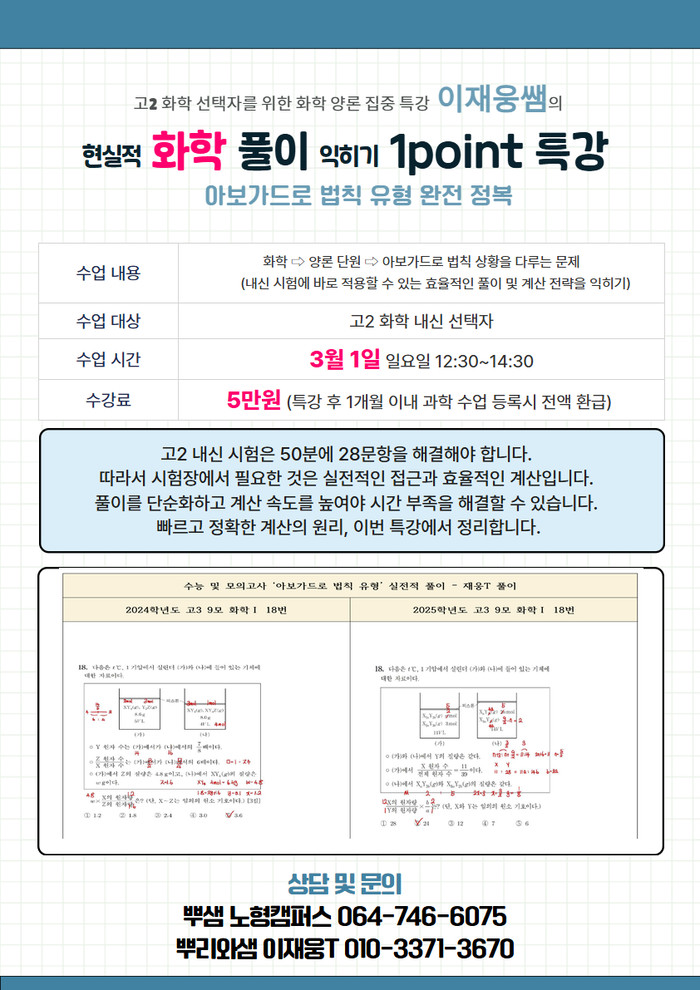 재웅샘의 물리 화학 1POINT 특강 상담 및 문의 : 노형 데스크 064-746-6075